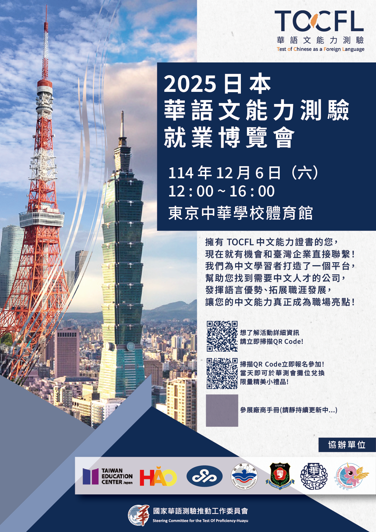 - 一、為拓展華語文能力測驗證書之國際應用與海外就業效益,國家華語測驗推動工作委員會特舉辦旨揭就業博覽會,邀請九家於日本投資之臺商企業,徵求具華語能力之日籍人才,相關資訊如下: